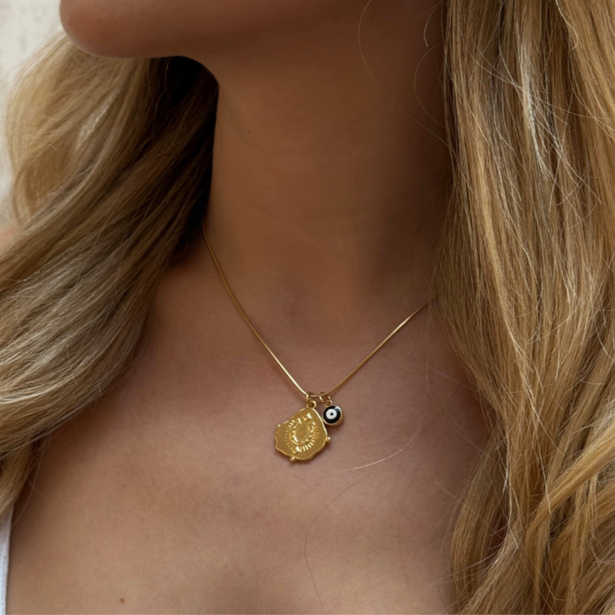 Este collar dorado con dije de herradura es mucho más que un accesorio, es un símbolo de protección y buena fortuna. Diseñado con un delicado ojo turco en el centro, combina elegancia y significado en una pieza única. La herradura, conocida por atraer la suerte, junto con el ojo turco que protege contra las malas energías, hacen de este collar el amuleto perfecto para llevar siempre contigo. Un detalle sutil, sofisticado y lleno de poder. ¡Luce con estilo mientras te rodeas de energía positiva!
